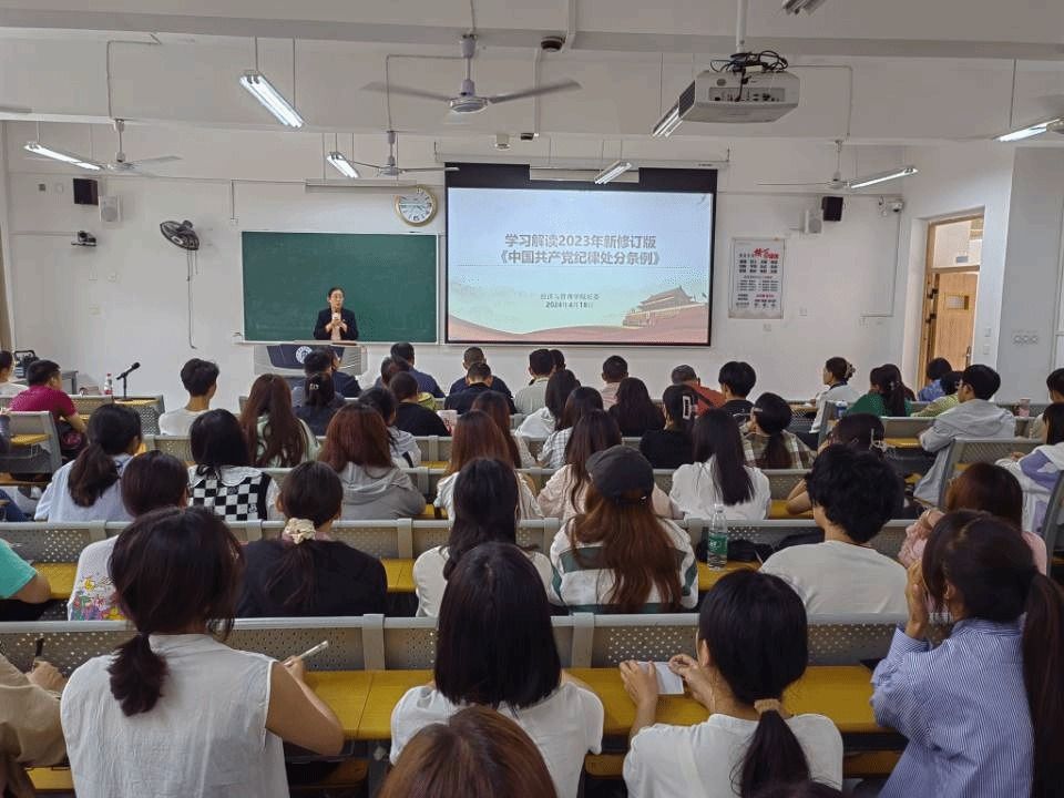 会上,王志萍首先从《条例》在党纪党规中的地位作用、历史沿革、基本概况三个方面作简要介绍,引导师生党员从宏观层面了解《条例》的重要作用和发展变革。此后,根据中央纪委国家监委法规室对《条例》的权威解读,王志萍从深刻认识修订《条例》的重要意义、准确把握《条例》修订的主旨要义、抓好《条例》的贯彻执行,以严明的纪律推进党的自我革命三个方面进行详细阐述,引导师生党员理解把握《条例》修订的出发点、落脚点、着力点,从而为全面学习和深入领会《条例》奠定坚实思想基础。最后,为便于师生党员更加直观地了解修订后的《条例》,王志萍比对中央纪委国家监委网站发布的《中国共产党纪律处分条例》修订条文对照表,围绕部分新增条款进行具体说明。