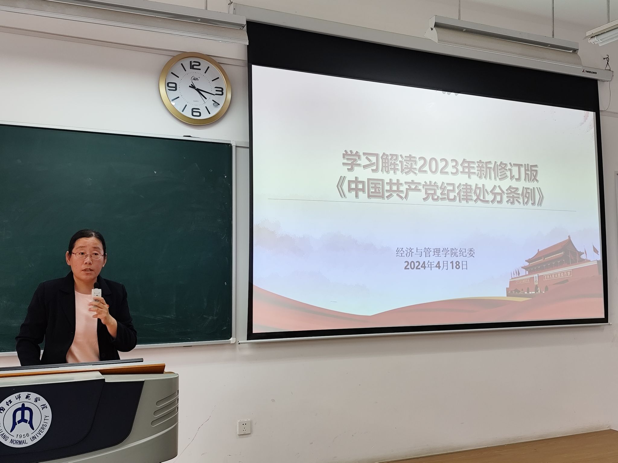 按照学校和学院党委党纪学习教育部署安排,为在全院师生党员中进一步营造重纪律、守规矩的浓厚氛围,发挥纪检干部先学一步、学深一层的领学带学促学作用,4月18日下午4点30,经济与管理学院纪委在明德楼B202教室组织开展党纪学习教育专题学习会,学院党委副书记、纪委书记王志萍作专题党课汇报,解读2023年新修订版《中国共产党纪律处分条例》(以下简称《条例》)。