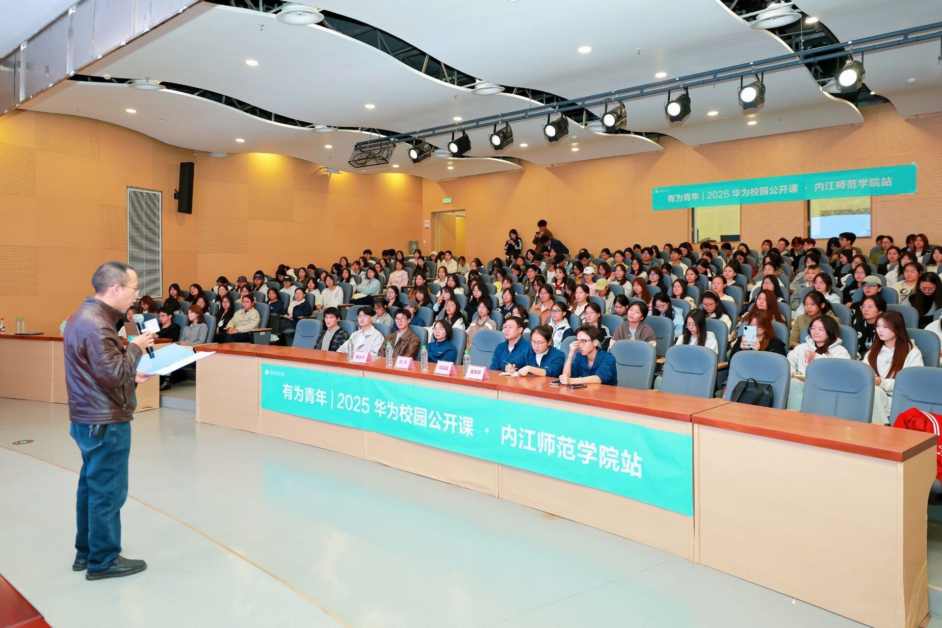 为引导经管学子感知优秀企业文化、了解行业发展前沿、提升求职就业技能,10月28日晚6点,2025华为校园公开课走进内江师范学院经济与管理学院。本次公开课由华为四川终端内资区域总经理刘昌颖主讲,华为四川终端业务部HR专员蒋全亭、经济与管理学院党委书记杨博、学工办副主任兼团委副书记鲁腾飞及260余名学生到场参与。