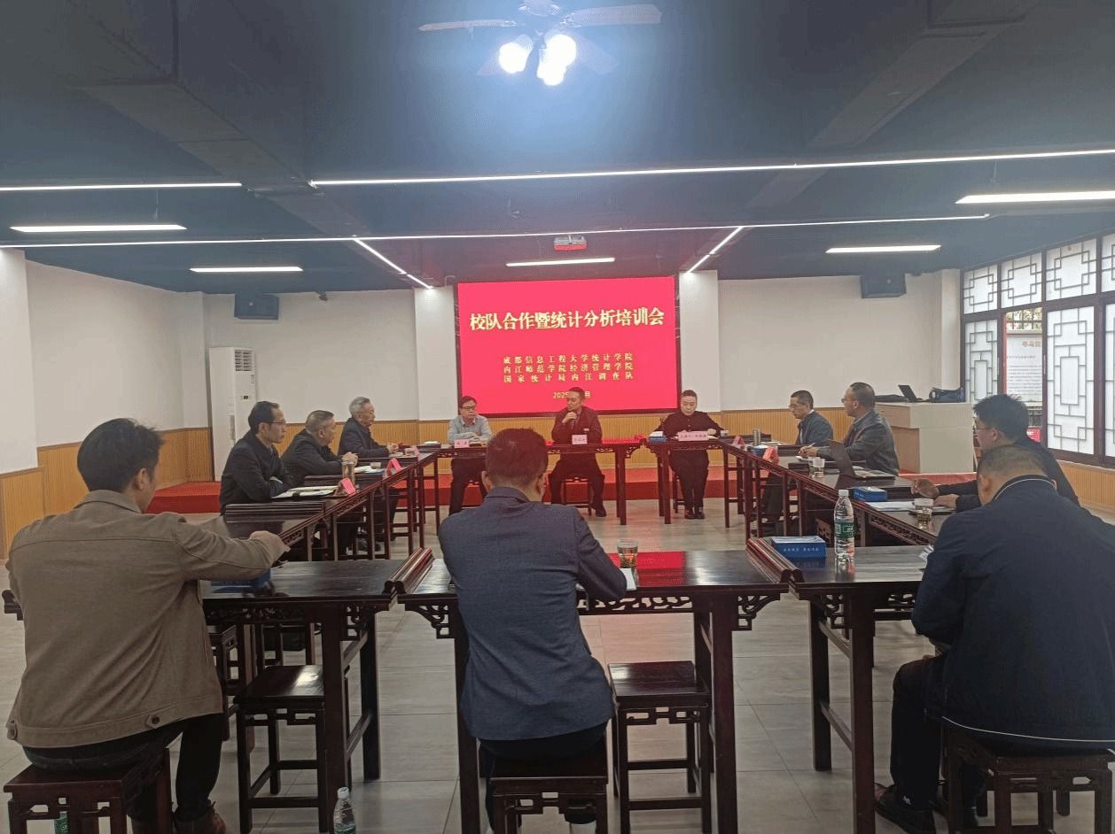 11月13日,成都信息工程大学统计学院、内江师范学院经济与管理学院与国家统计局内江调查队,在国家调查实践基地联合召开校队合作暨统计分析培训会。会议以“深化校队合作、赋能统计高质量发展”为主题,三方齐聚一堂,共商合作新路径、共话发展新蓝图。国家统计局四川调查总队党组成员、总统计师夏龙生与会指导。学院副院长(主持工作)康超教授、杨杰博士、杨泽东博士参加会议。