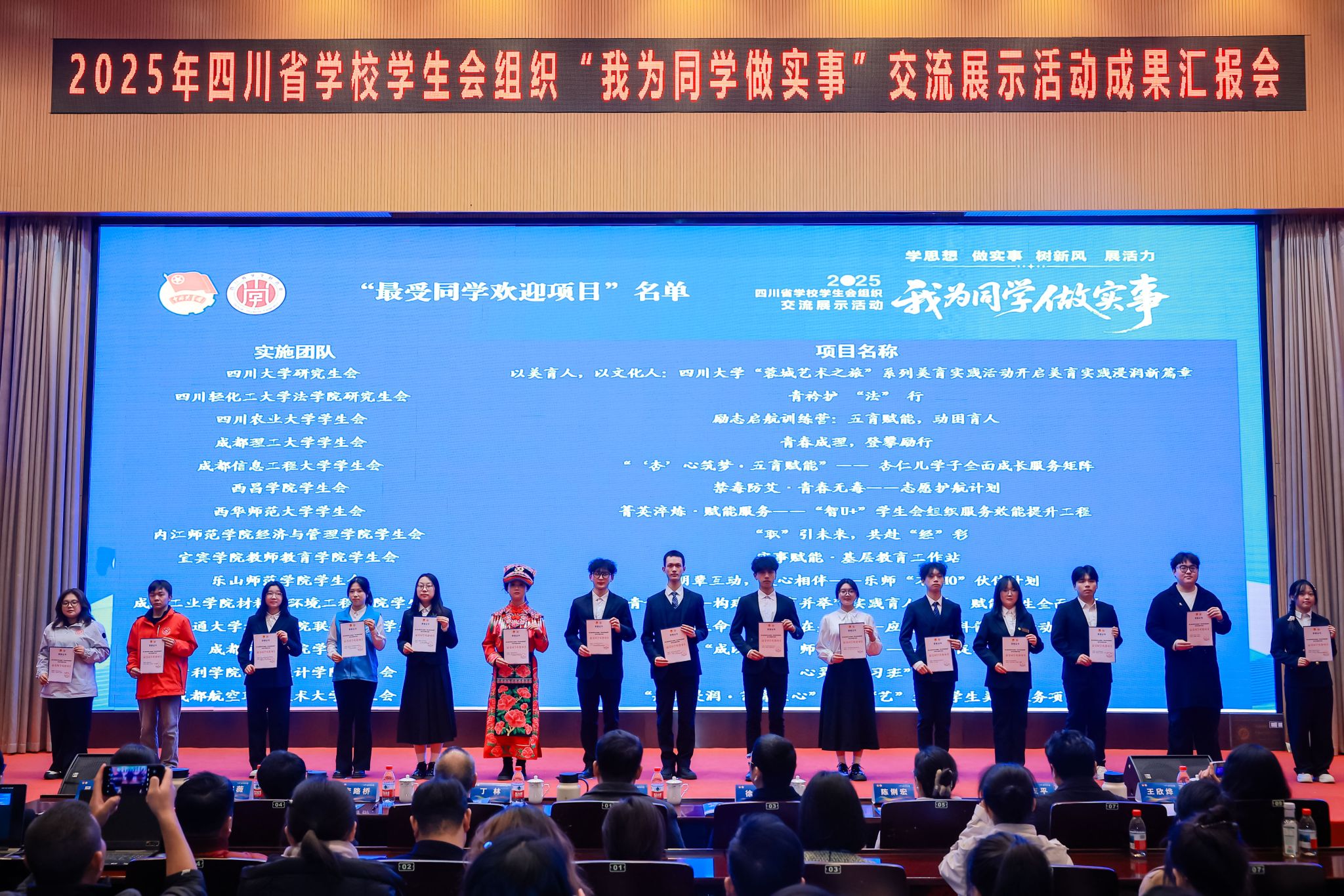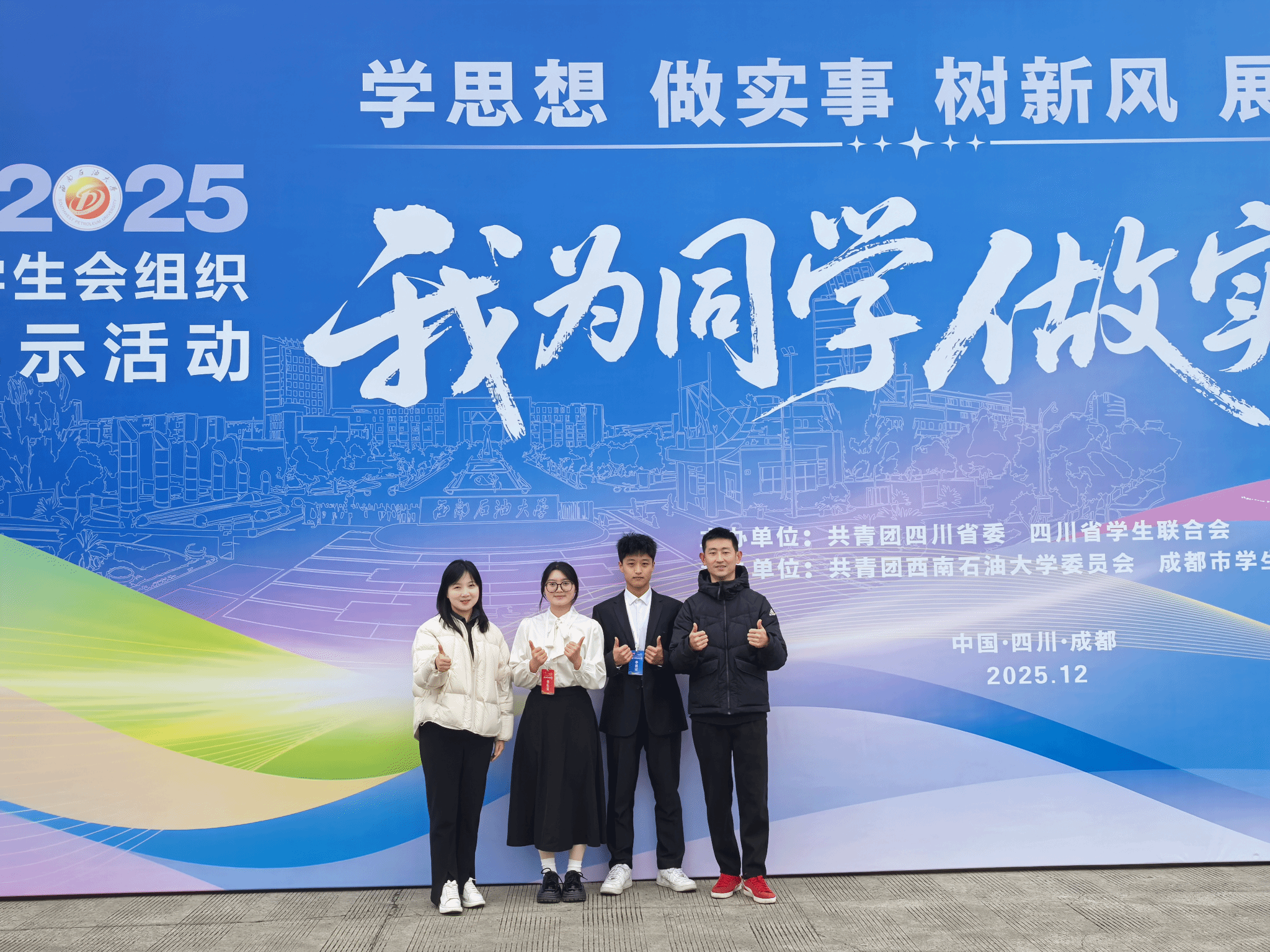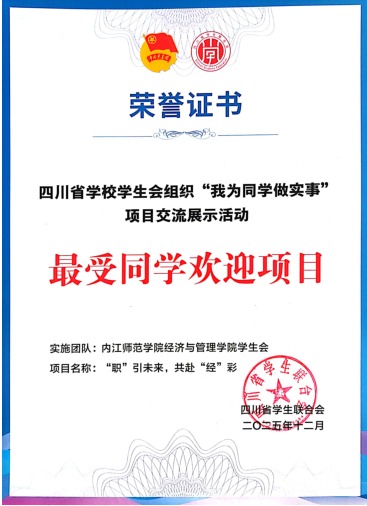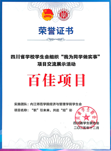 2025年12月14日至15日,由共青团四川省委、四川省学生联合会主办的“我为同学做实事”交流展示活动在西南石油大学成功举办。经济与管理学院学生会推报的就业创业类项目通过前期遴选和现场答辩等环节,最终在全省214所学校报送的381个服务同学项目中荣获全省“百佳项目”和“最受同学欢迎项目”。