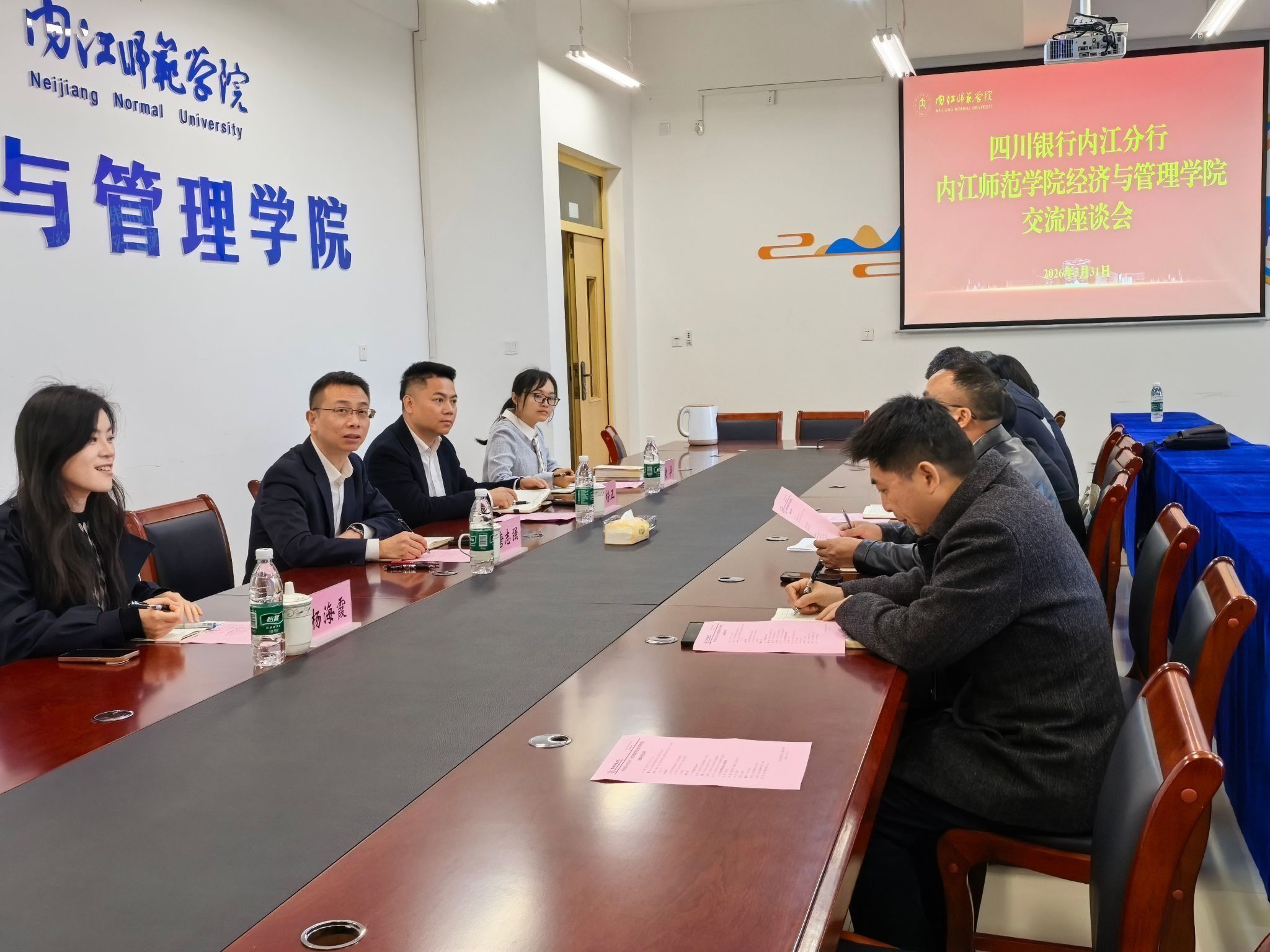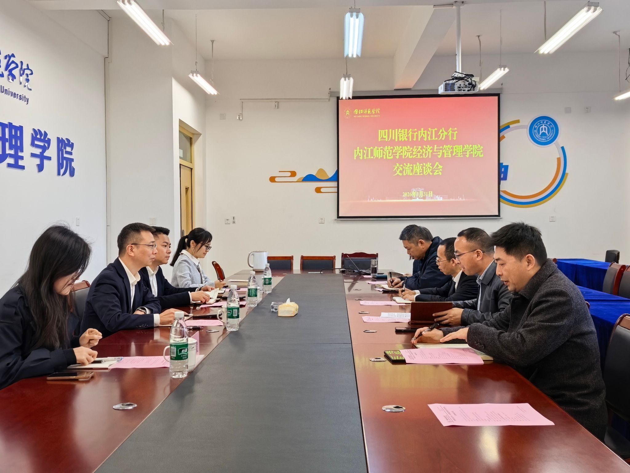 2026年3月31日上午,四川银行内江分行党委委员、副行长唐志强率队来校与经济与管理学院党政班子在弘文楼320会议室交流座谈。双方聚焦人才培养、产学研融合、金融服务地方经济等议题展开深入探讨,旨在构建长期稳定的战略合作关系,共同服务于区域经济社会高质量发展。