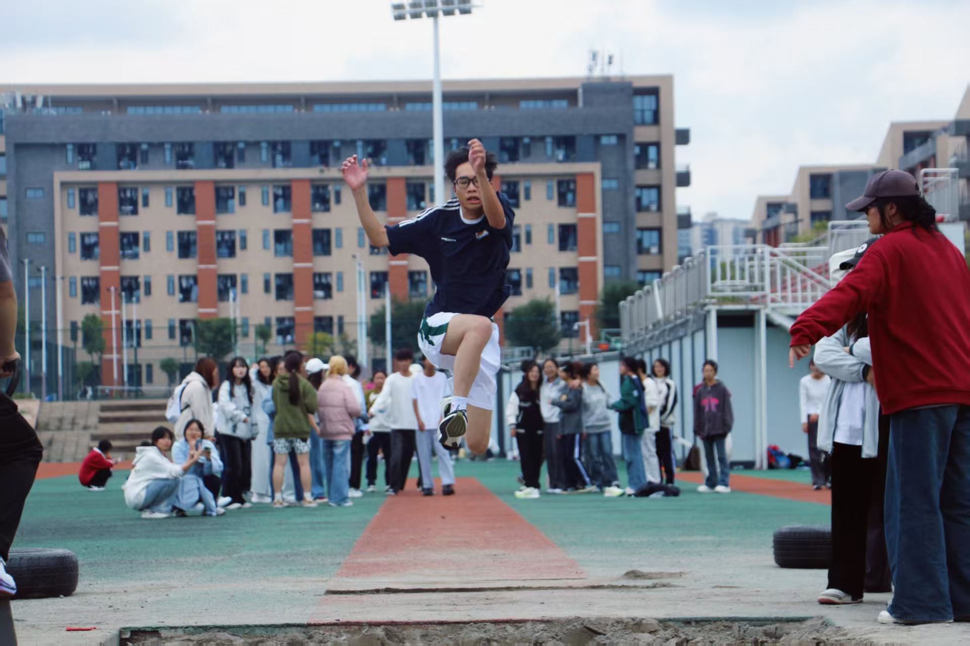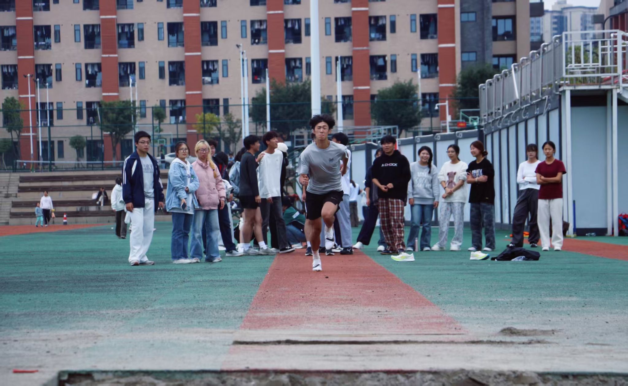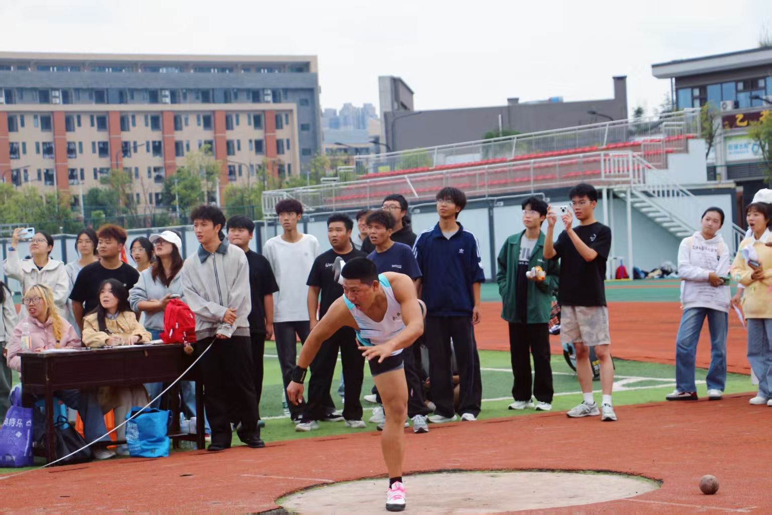 田赛同样精彩纷呈。跳远场地上,一道道矫健的身影在助跑、起跳、腾空、落地中丈量着青春的跨度;铅球赛区,25.6班木课布合同学以14.7米的超远投掷一锤定音,沉甸甸的铁球在空中划出充满力量的弧线,展现了力量与技巧的完美结合。赛场边,此起彼伏的加油声、呐喊声、掌声,汇聚成一片热情的海洋,将现场气氛不断推向高潮。