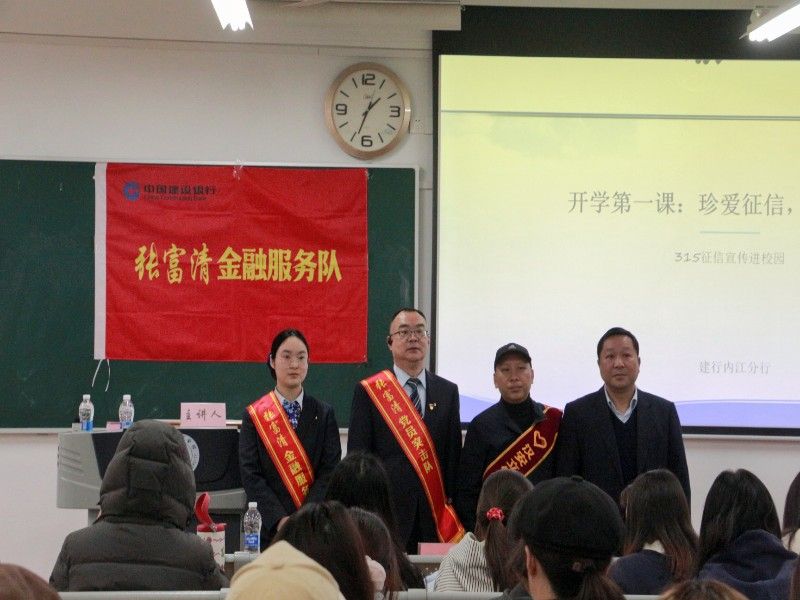 3月13日上午10时20分,建设银行内江分行“张富清金融服务队”走进内师经管学院,在明德楼A210开展“珍爱征信,守护未来”征信宣传活动。学院副院长胡艳、学工办老师许军红及百余名学生代表、学生党员参加活动。