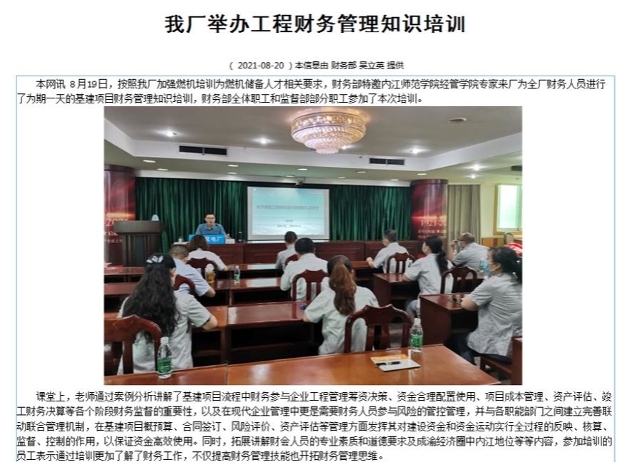 2021年暑假期间,应内江白马电厂的邀请,我院教师吴小云多次到厂调研,并在8月19日为其举行了为期一天的电厂新项目基建财务管理知识培训。调研培训效果好,展现出吴小云老师扎实的社会服务能力。